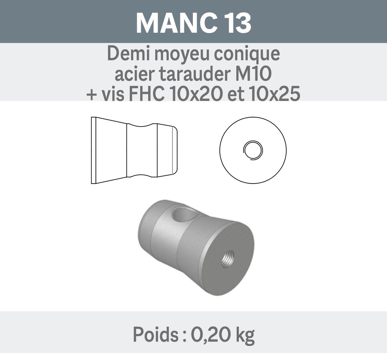 DEMI MOYEU CONIQUE ACIER TARAUDER M10 + VIS FHC 10X20 ET 10X25. (Ref : AL MANC 13)