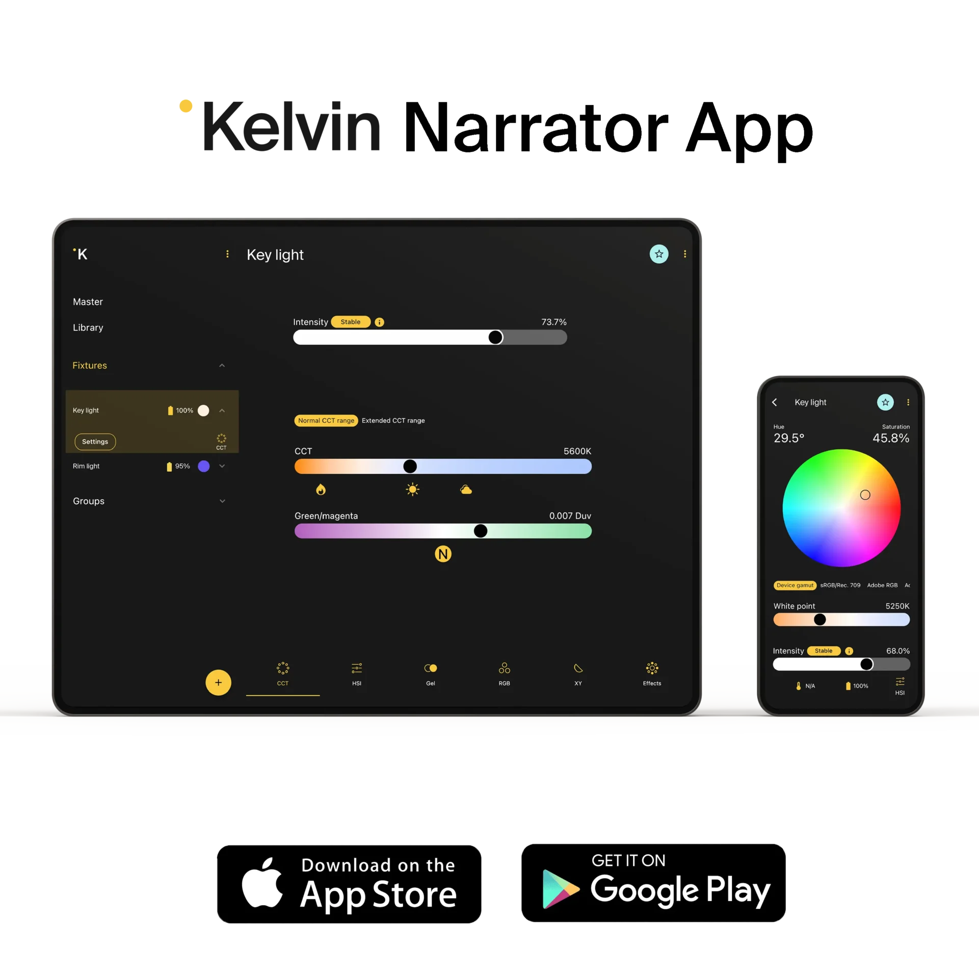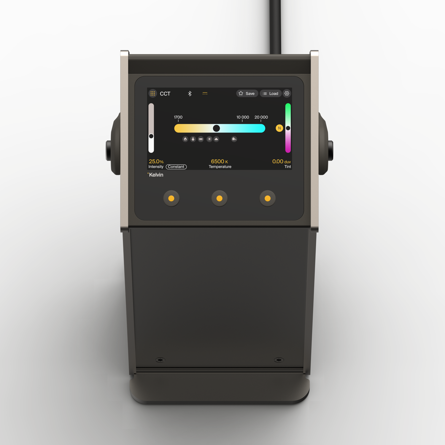 Un écran tactile intuitif associé à des boutons physiques permet de facilement contrôler le projecteur afin de produire avec précision le faisceau lumineux souhaité. L’afficheur haute résolution et la précision des librairies de gélatine vous donnent le contrôle pour que tout ressemble exactement à ce que vous imaginez. En alternative ou en complément de l’écran tactile, des boutons physiques permettent de contrôler le projecteur (avec des gants dans le froid de l'hiver norvégien). L’application gratuite Kelvin Narrator présente une autre alternative de contrôle du projecteur à partir de votre smartphone.