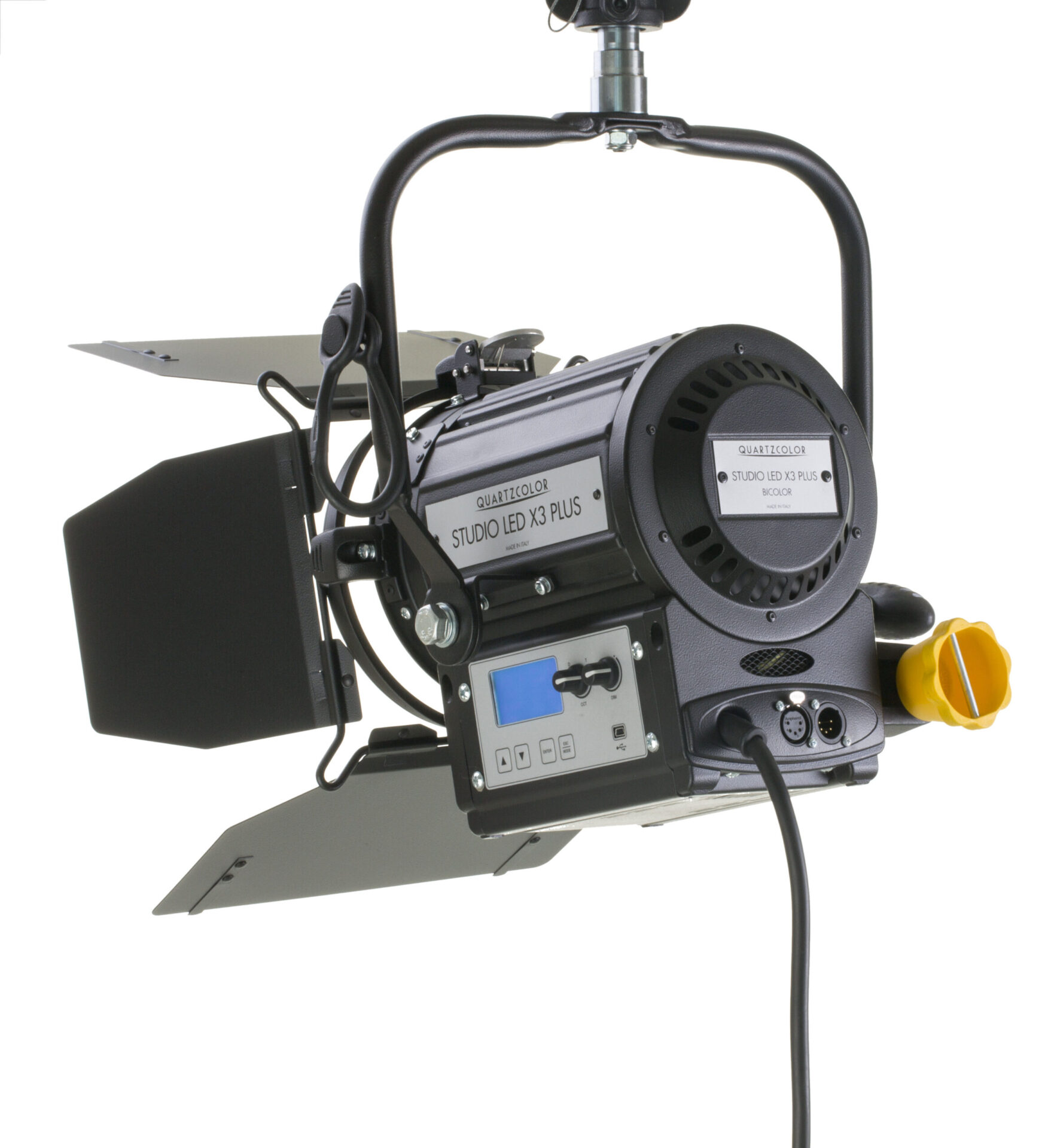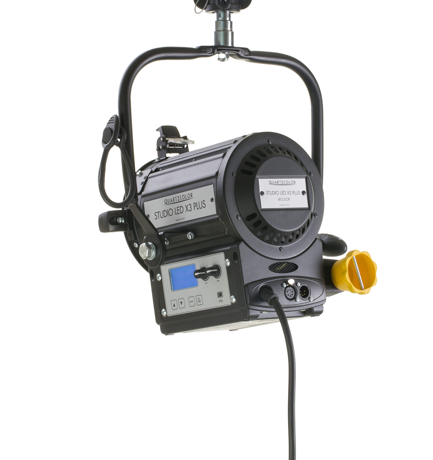 Studio LED X3 PLUS Fresnel 100W BI-COLORPO. Head fitted w/Fresnel lens Ø130mm, dinamic adjustable CCT from 2700 K to 6500 K, 5m length bare ended cable, in-lineswitch, built-in universal power supply (90-240V, 50/60Hz), electronic dimming 16 bit, LCD graphic display, internal sensor temperature, on board dimming, USB port, RDM-DMX in/out connectors, manual stirrup with 28mm (1⅛") spigot. Supplied w/stainless steel wire guard, 4-leaf rotating barndoor Ø200mm. (Ref : QC LD27642B)