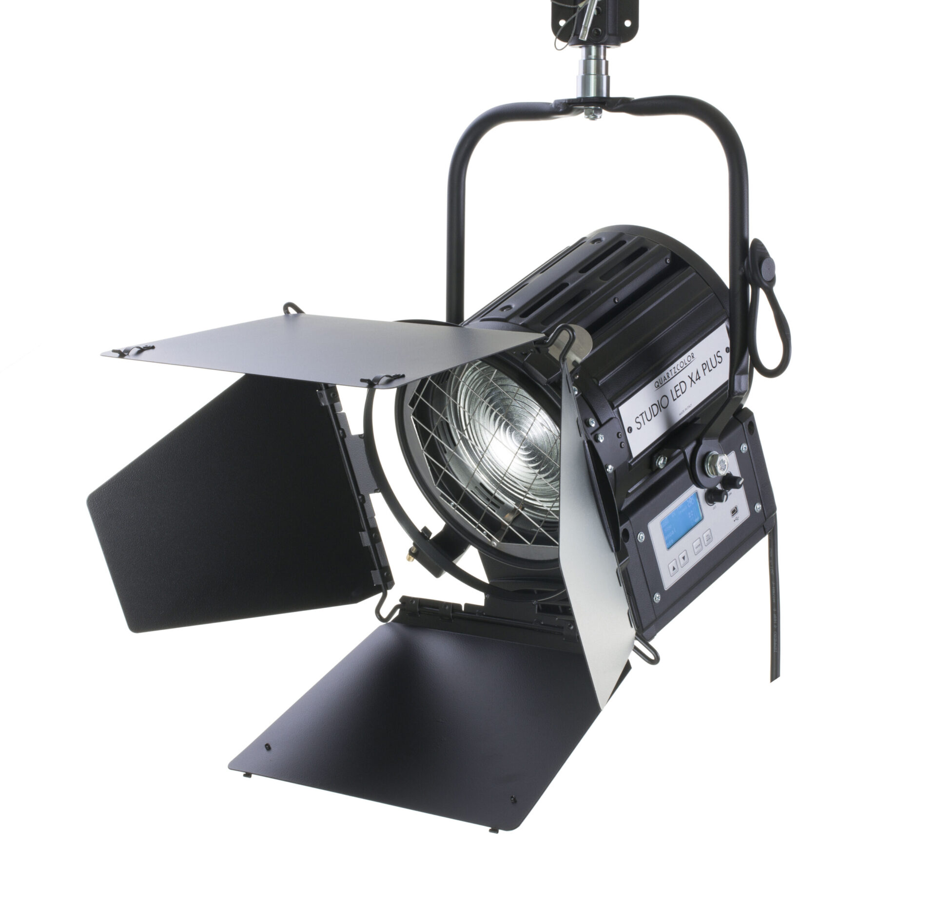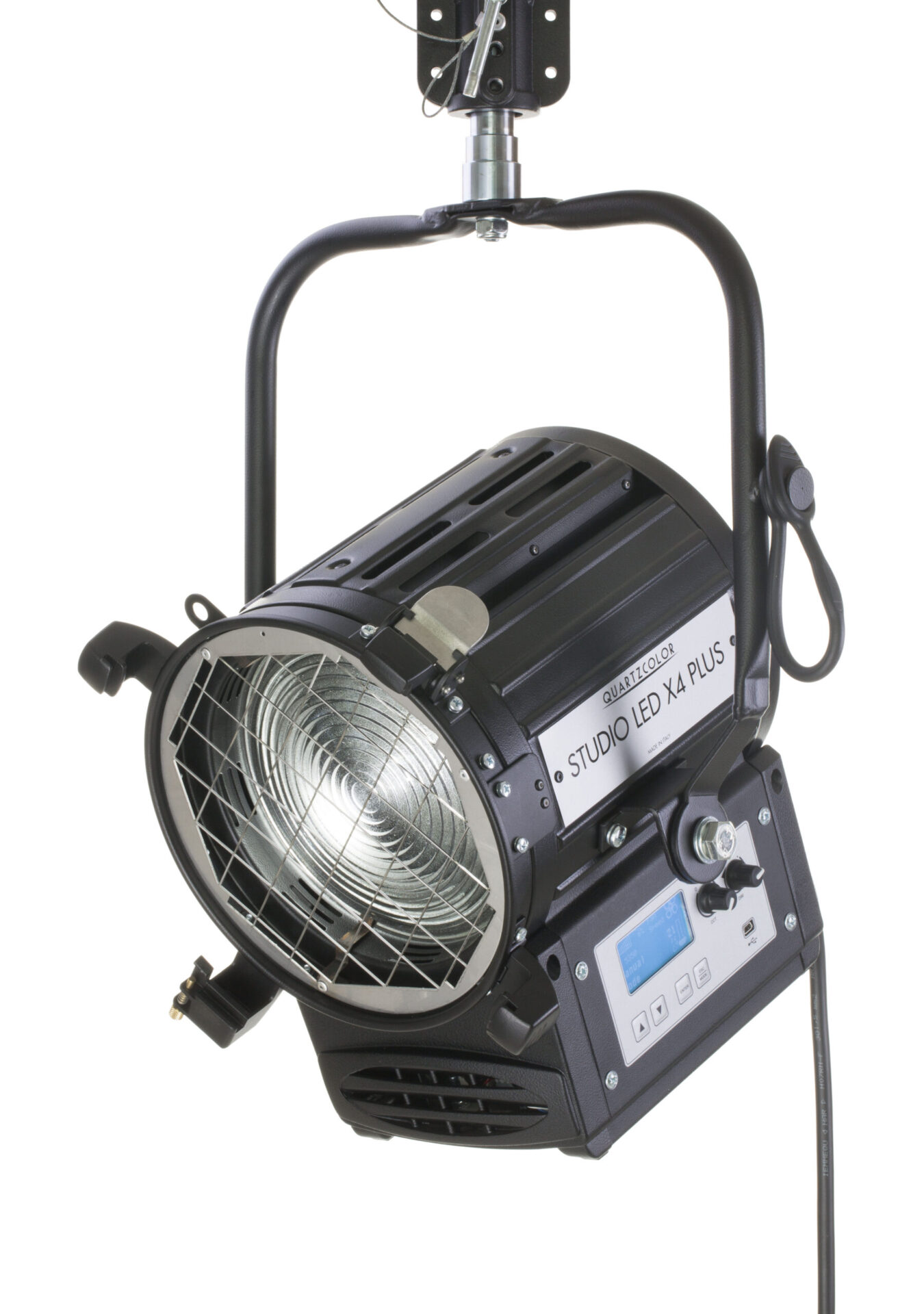 Studio LED X4 PLUS Fresnel 150W BI-COLORMO. Head fitted w/Fresnel lens Ø175mm, dinamic adjustable CCT from 2700 K to 6500 K, 5m length bare ended cable, in-lineswitch, built-in universal power supply (90-240V, 50/60Hz), electronic dimming 16 bit, LCD graphic display, internal sensor temperature, on board dimming, USB port, RDM-DMX in/out connectors, manual stirrup with 28mm (1⅛") spigot. Supplied w/stainless steel wire guard, 4-leaf rotating barndoor Ø269mm. (Ref : QC LD27250B)