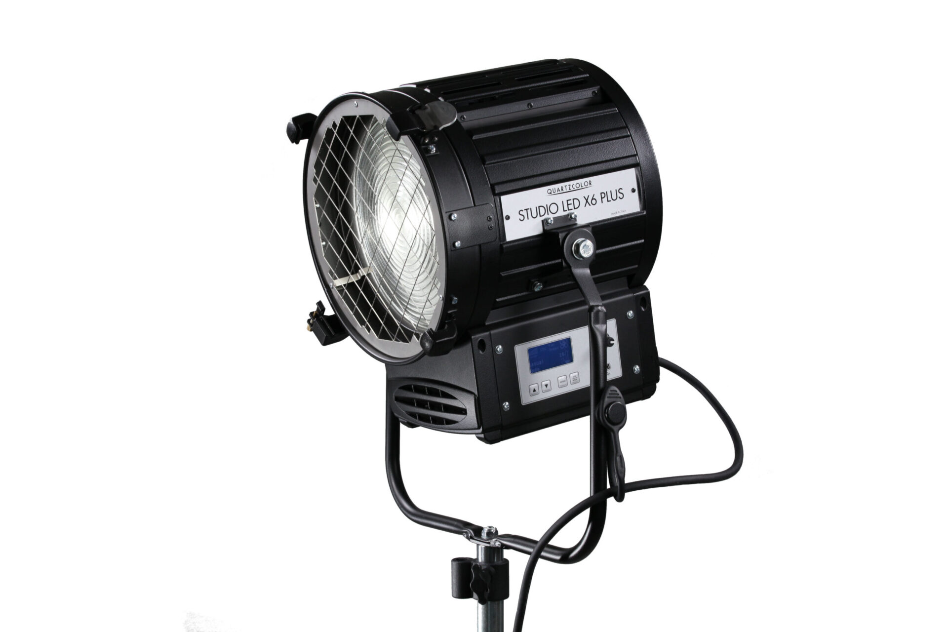 Studio LED X6 PLUS Fresnel 300W Daylight MO. Head fitted w/Fresnel lens Ø250mm, 5m length bare ended cable, in-lineswitch, built-in universal power supply (90-240V, 50/60Hz), electronic dimming 16 bit, LCD graphic display, internal sensor temperature, on board dimming, USB port, RDM-DMX in/out connectors, manual stirrup with 28mm (1⅛") spigot. Supplied w/stainless steel wire guard, 4-leaf rotating barndoor Ø323mm. (Ref : QC LD27360D)