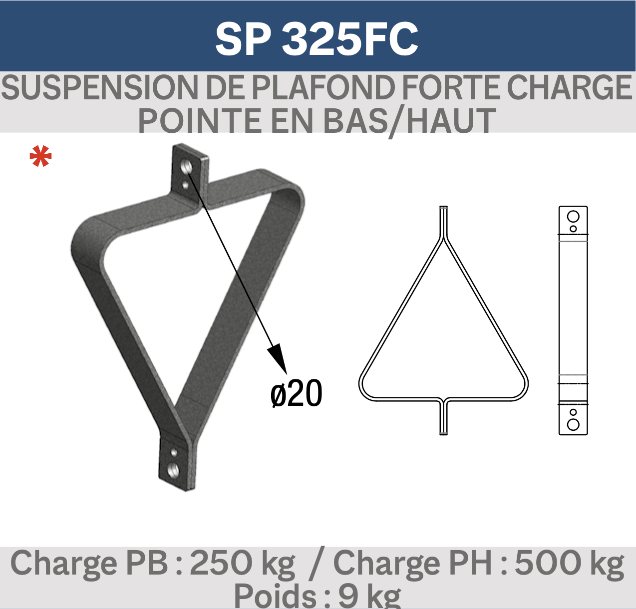 SUSPENSION DE PLAFOND FORTE CHARGE TRI 290 POINTE EN BAS/HAUT. (Ref : AL SP 325FC)